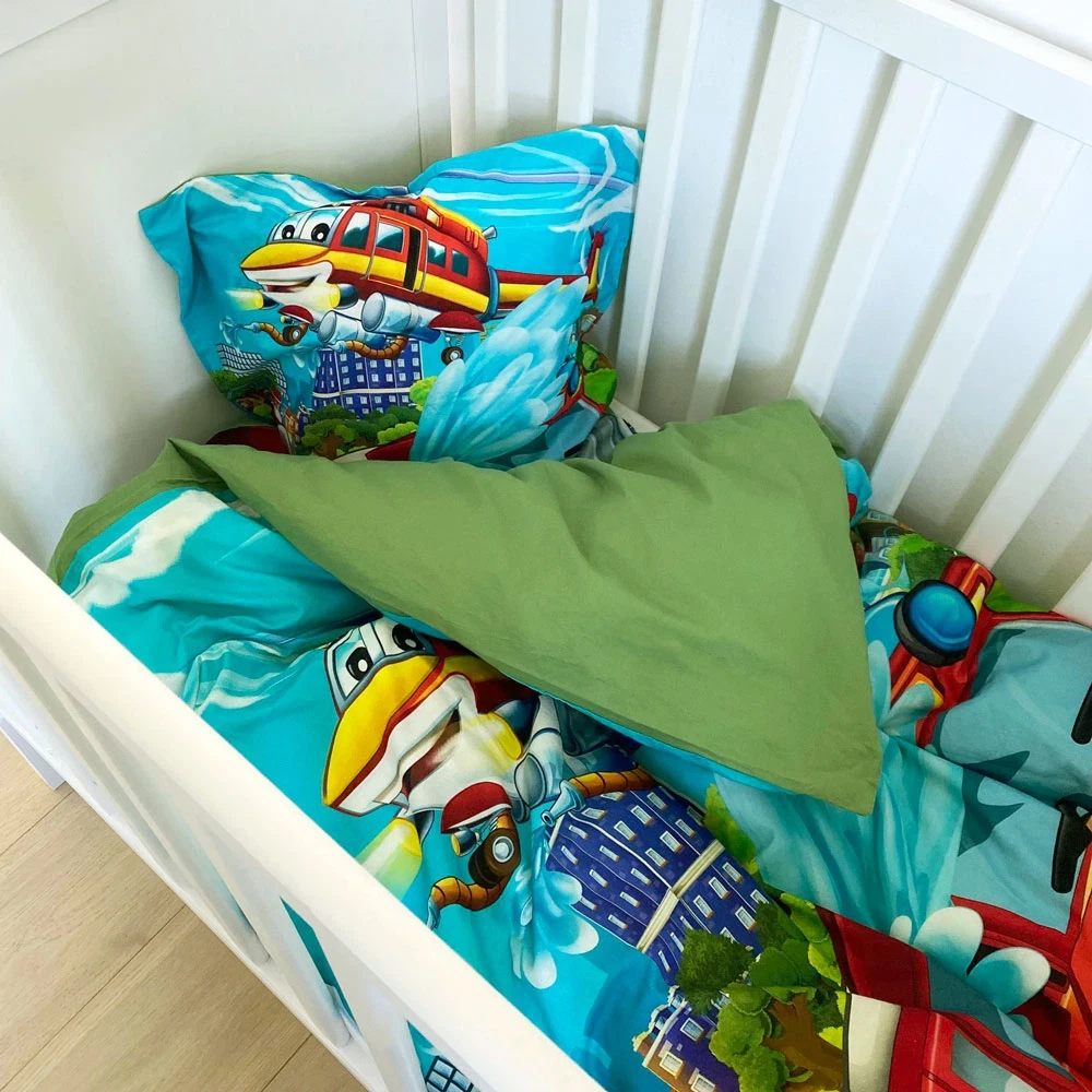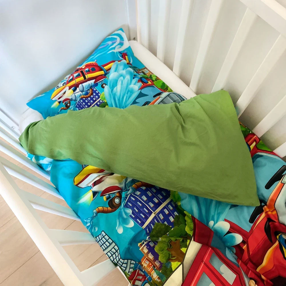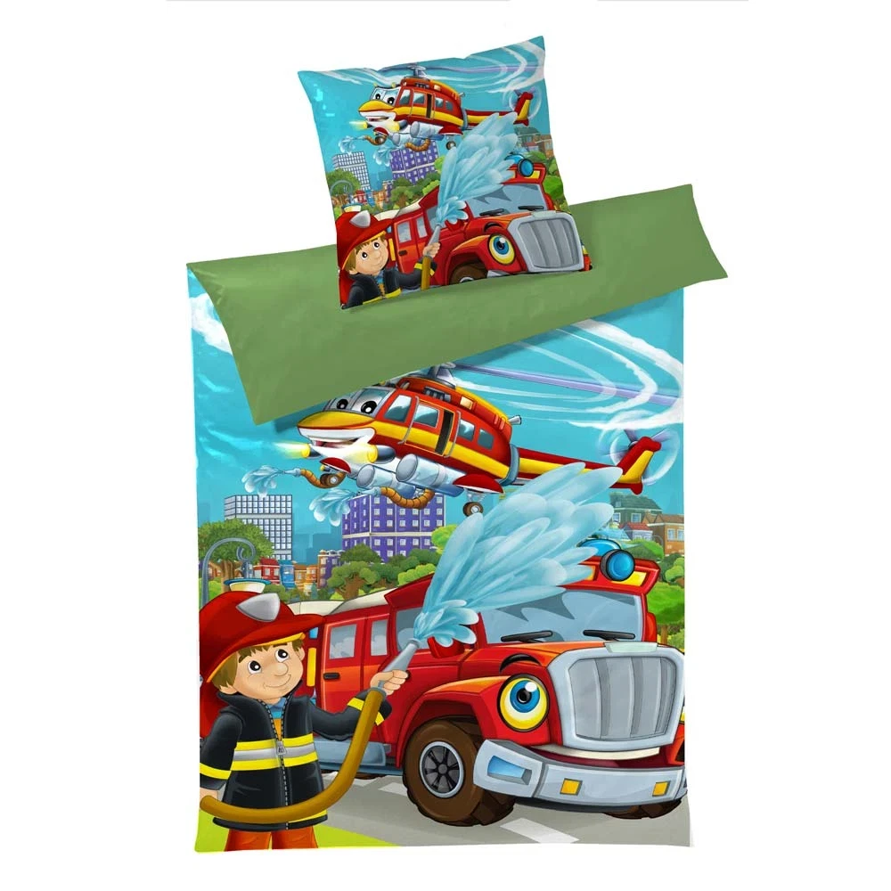2 i 1 print - forside med motiv af det fineste brandmandstema, bagside i ensfarvet grøn, som med garanti vil gøre ethvert børneværelse ekstra hyggeligt. Junior sengetøjet er vævet af fine Oeko-Tex certificeret bomuldsgarner, hvilket giver en dejlig blød fornemmelse for barnet at sove med. Vaskes ved 60 grader og tørretumbles.